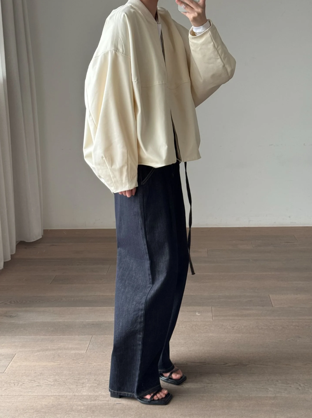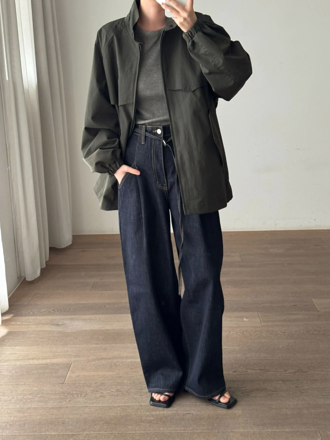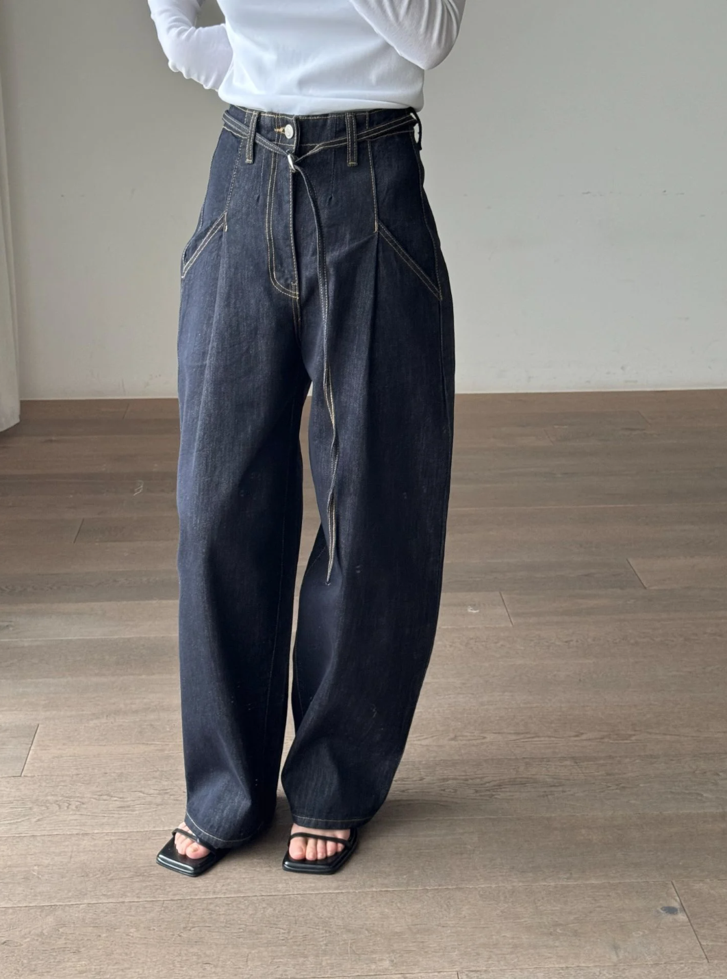 Color: Navy Denim fabric High-rise waist Relaxed fit Wide leg Full length Belt detail at waist Belt loops Front pockets Back pockets Zip fly Button closure Made in South Korea